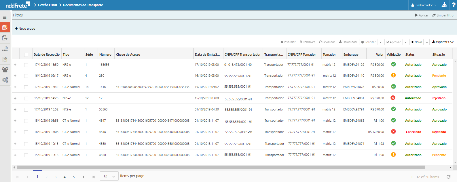 Emitente (transportador do Embarque), Destinatário, e Valor.