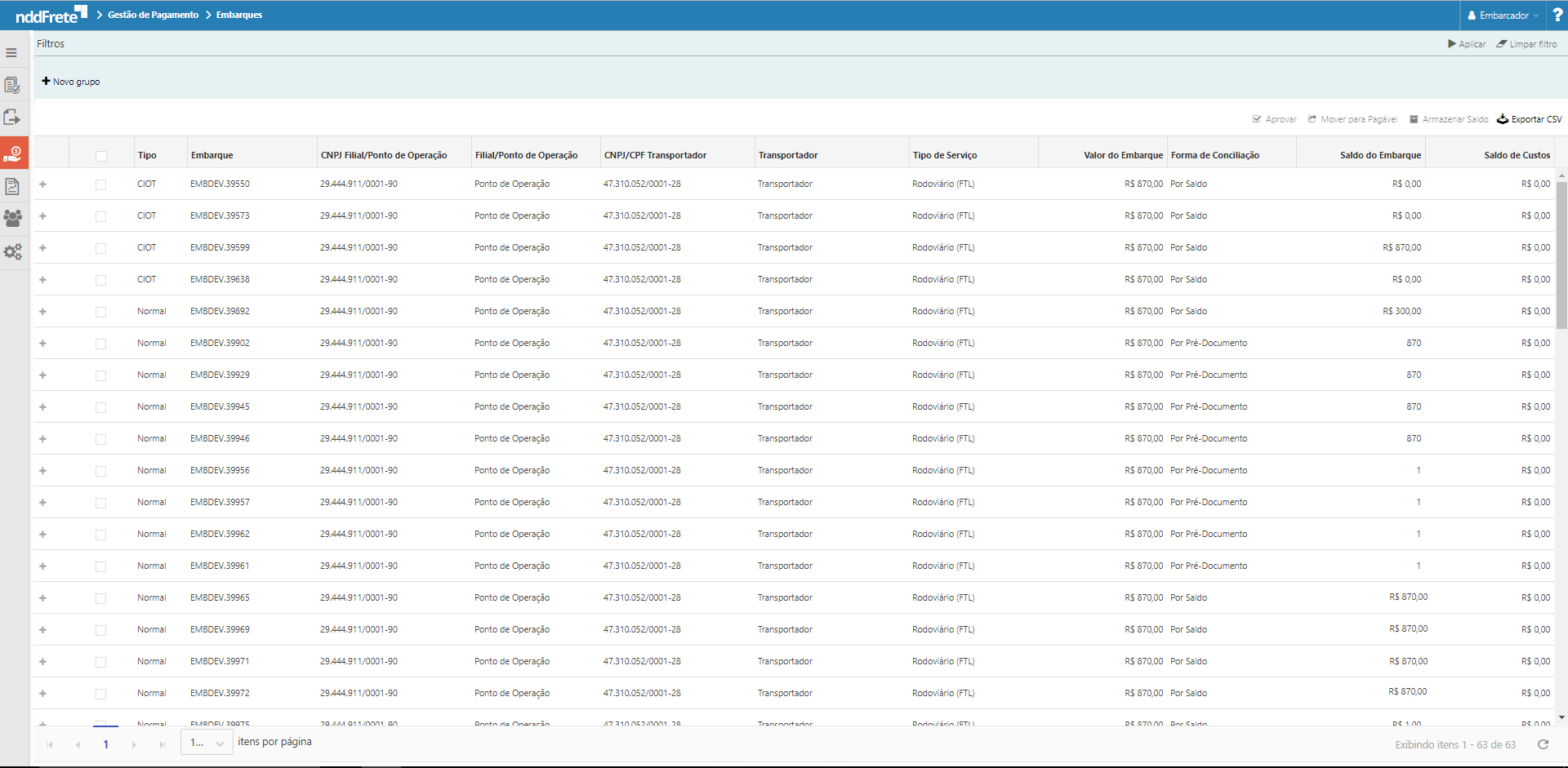 •CNPJ/CPF do Transportador: CNPJ ou CPF do transportador do Embarque;
