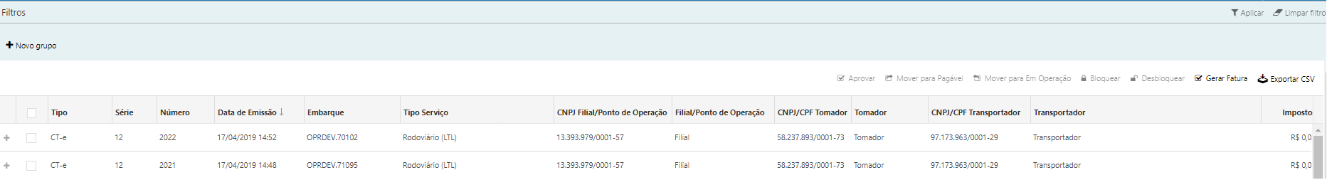CT-es normais que possuem CT-es complementares não podem ser movidos para operação caso o complementar não esteja em operação ou também selecionado; CT-es complementares podem ser movidos para em operação sem que o CT-e normal esteja em operação ou sem estar selecionado também. |