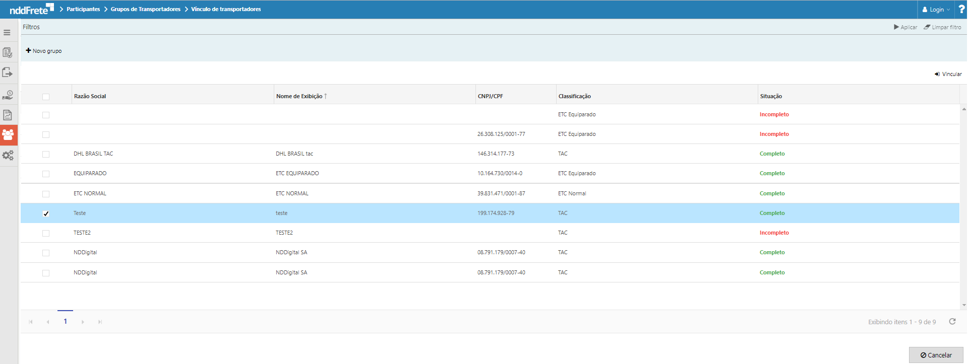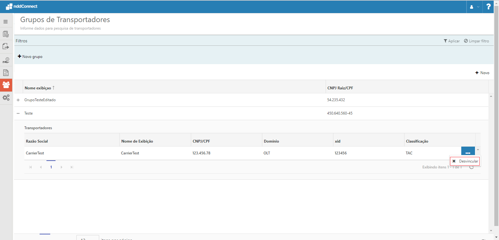 •Vincular transportadores: Permite vincular novos transportadores ao grupo selecionado.