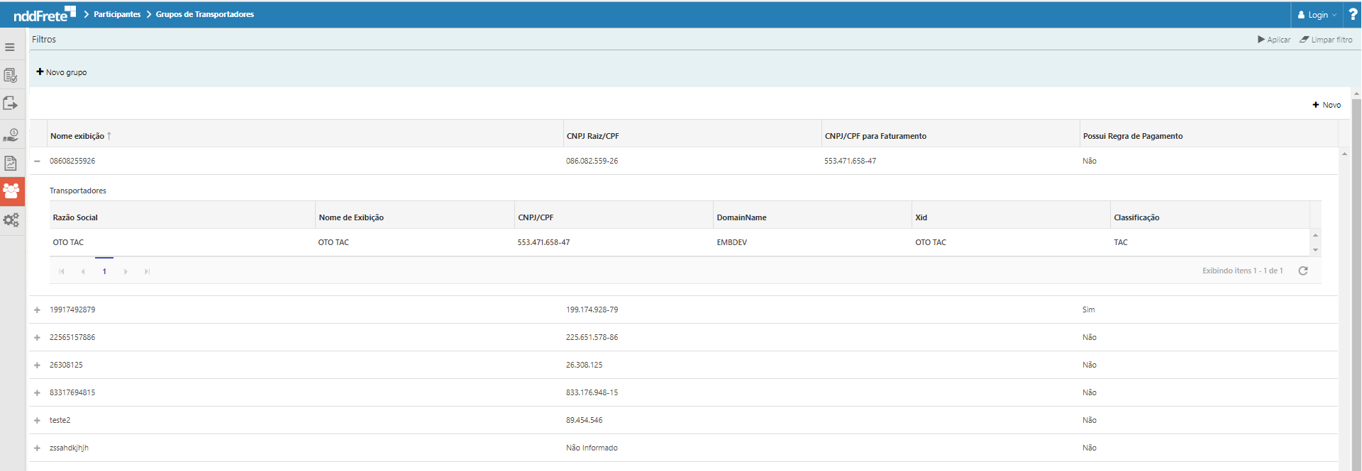 Na tela principal estão disponíveis os grupos já existentes e os transportadores vinculados aos mesmos.