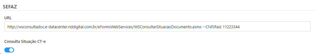 •URL: Campo para informe do endereço de consulta da situação do CT-e na SEFAZ. Este endereço será utilizado para consultar a situação do CT-e na recepção do CT-e na Gestão Fiscal e na validação da Fatura na Gestão de Pagamento.
