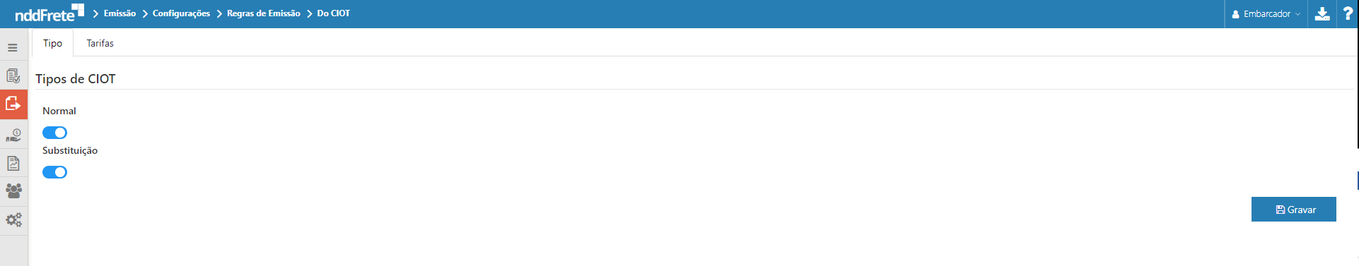 Normal: Essa opção sempre ficará ativa, não sendo permitido sua alteração, indica que sempre será emitido um CIOT do tipo normal quando o mesmo atender os requisitos de emissão de CIOT.