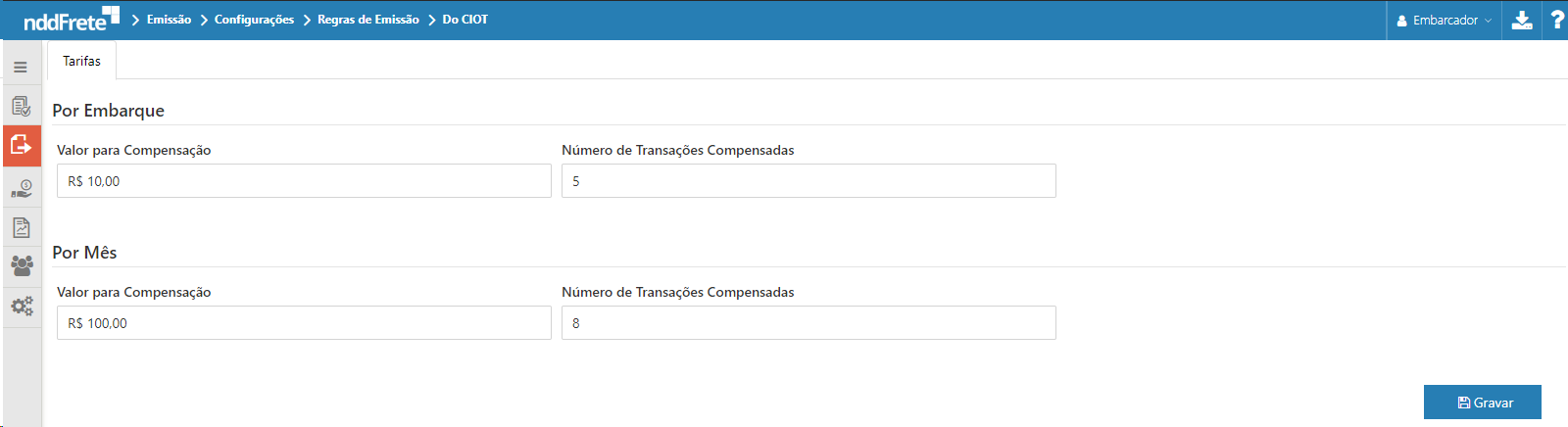 A aba Tarifas apresentará o formulário para configuração das tarifas a serem informadas no CIOT emitido.