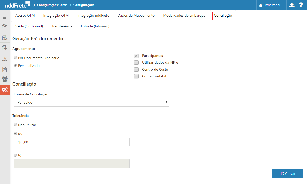 •Por Saldo: O pré-documento não será gerado e a conciliação deve ser realizada pelo saldo do Embarque.