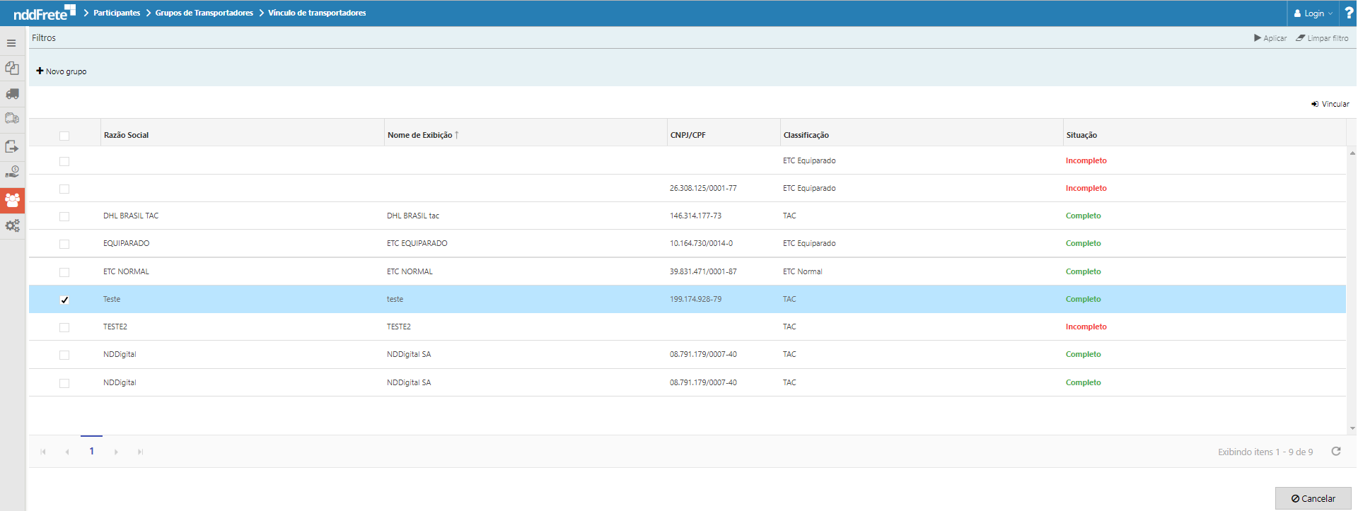 Vincular transportadores: Permite vincular novos transportadores ao grupo selecionado.