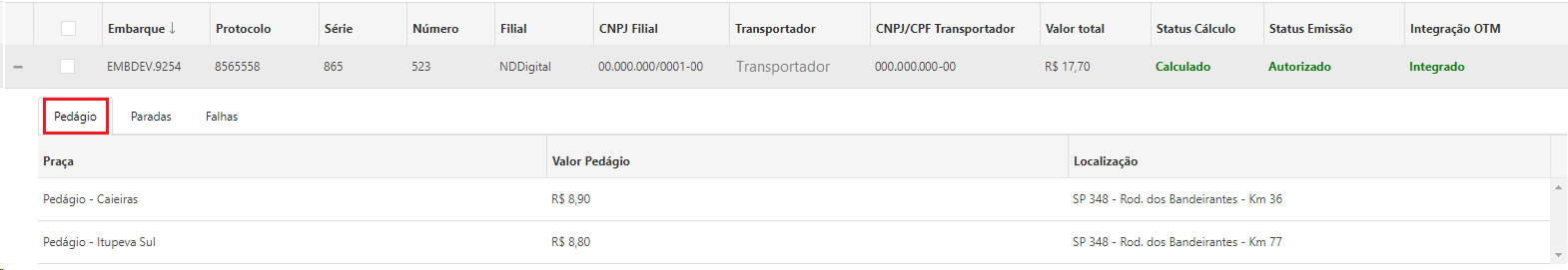 •Pedágio: Valores de cada praça de pedágio encontrada conforme paradas informadas no embarque.