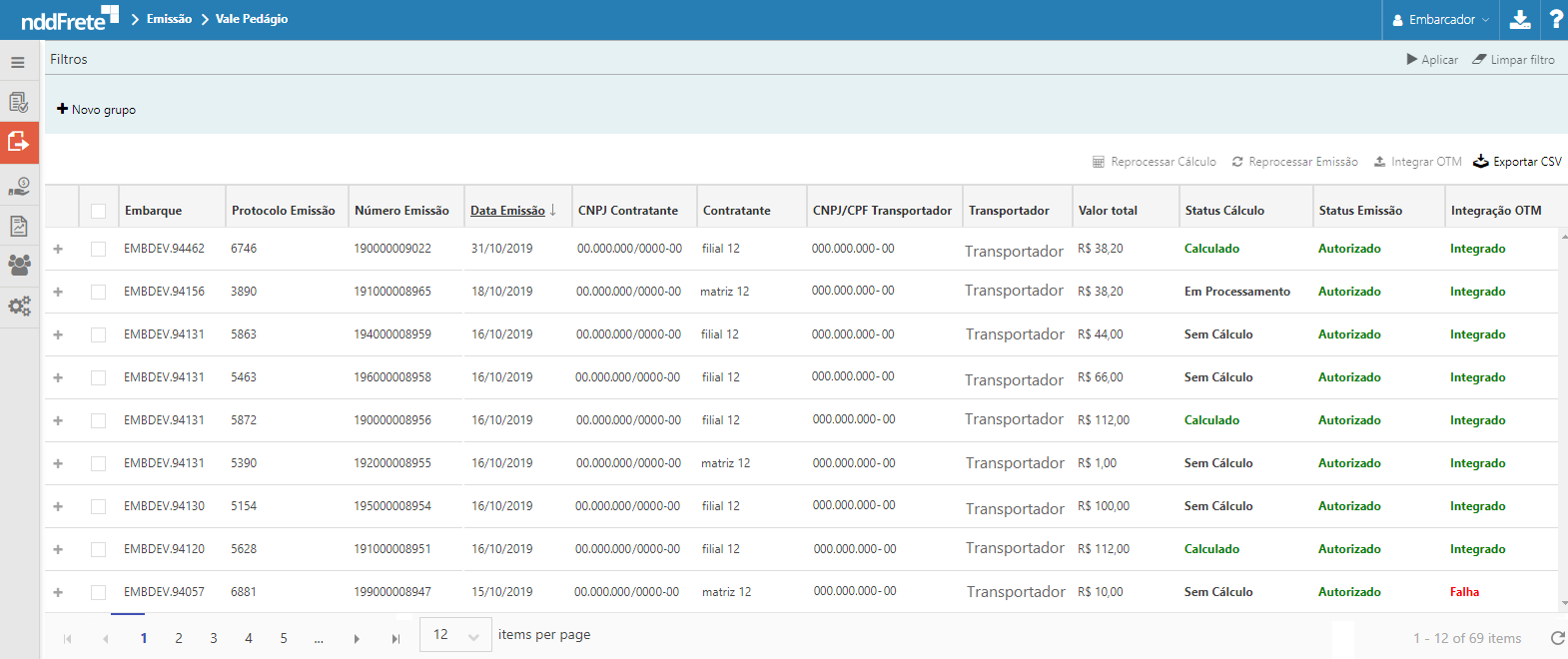 •Status Emissão: Status da emissão do vale-pedágio, podendo obter o status igual à Pendente, Autorizado, Em Processamento , Falha e Cancelado.