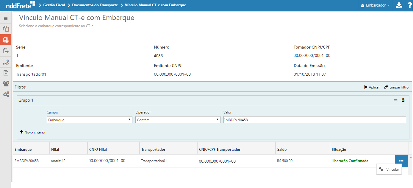 Ao ingressar nesta tela o usuário deve realizar os filtros necessários para encontrar o embarque a qual deseja vincular o documento.