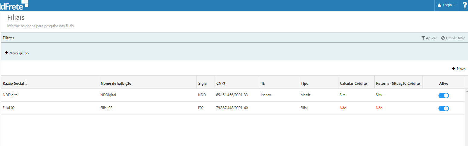 Para cadastrar uma nova filial, clique no botão Novo, o qual fica à direita, acima dos registros já cadastrados.