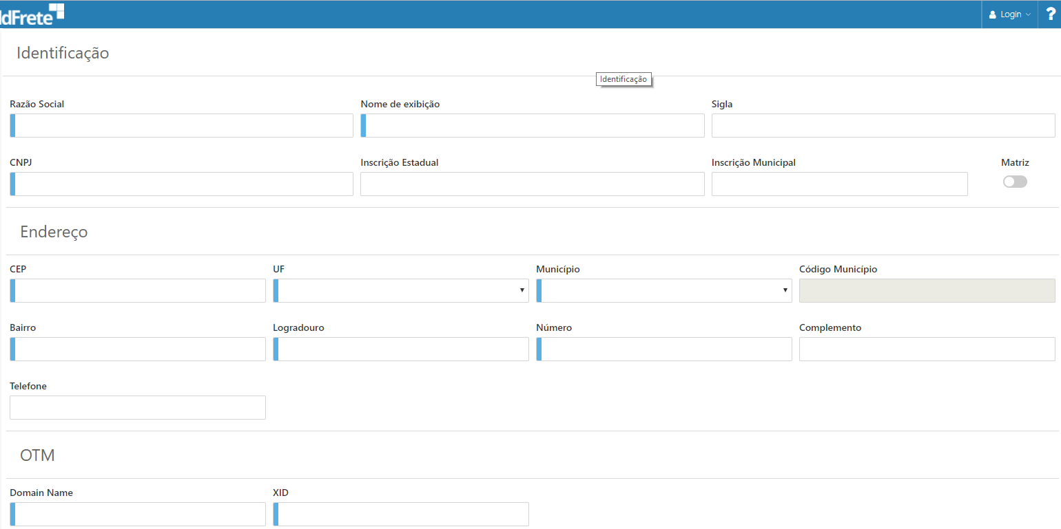 •Identificação: Onde deve ser informado os dados de identificação da filial, podendo ativar o campo Matriz, de forma a informar se a filial cadastrada refere-se a uma matriz ou não.