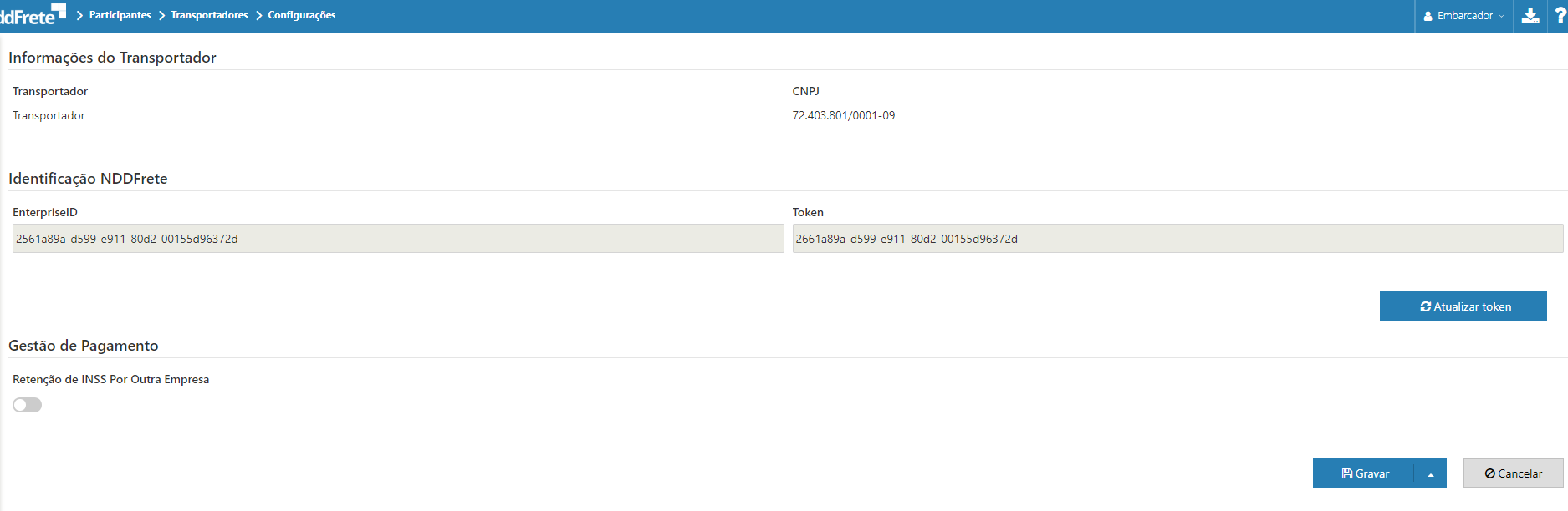 Os dados de identificação nddFrete, são criados automaticamente na recepção do transportador. Porém é possível atualizar o token, para que as informações de autenticação com o web service sejam renovadas. |