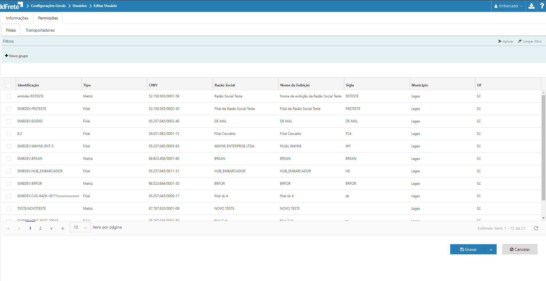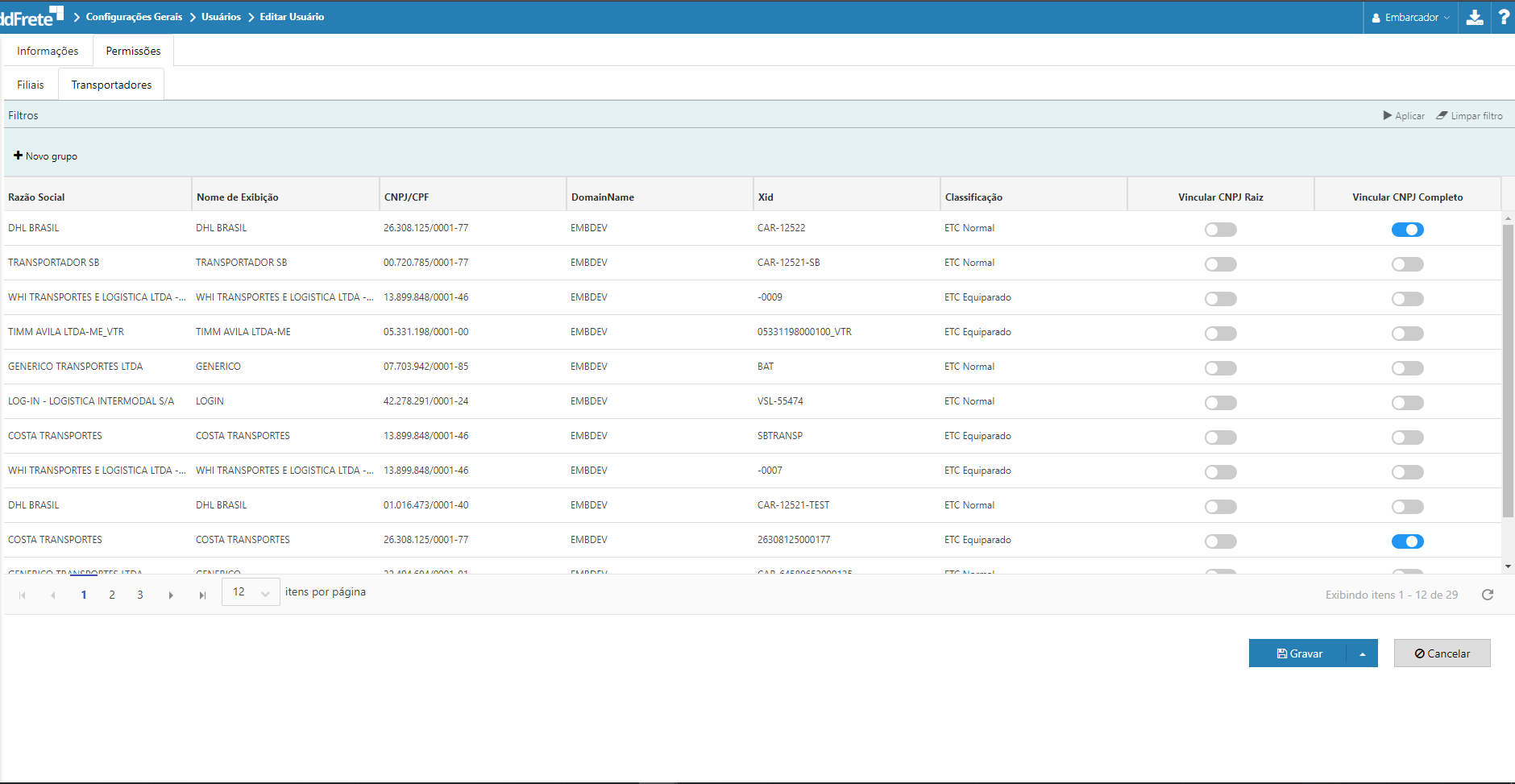 É necessário habilitar quais transportadores estarão visíveis para o usuário. Esta configuração é realizada através da aba Permissões. Conforme mostra a tela abaixo, é possível vincular o CNPJ completo ou apenas o CNPJ Raiz, onde será considerado apenas os oito primeiros dígitos.