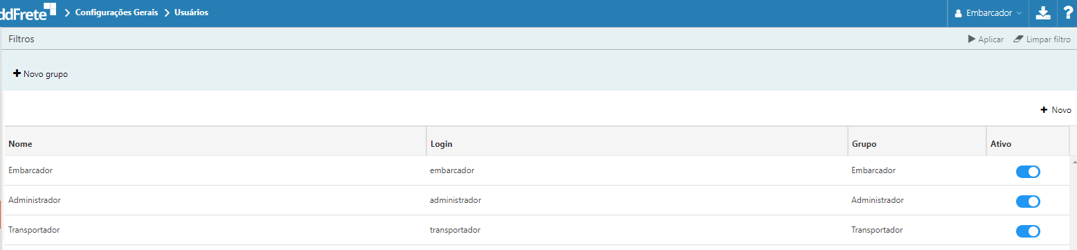 Os campos mostrados na imagem abaixo são obrigatórios para concluir o cadastro, o campo Grupo define o modelo de usuário e as respectivas funções que ele terá acesso.