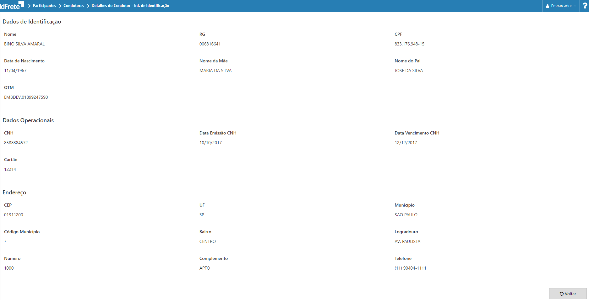 No menu de contexto está disponível a opção de detalhes, onde é possível visualizar as informações de identificação, dados operacionais e endereço do condutor.