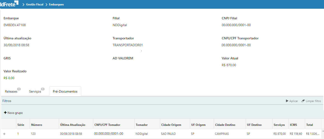 O pré-documento construído pelo sistema nddFrete contém as seguintes informações: