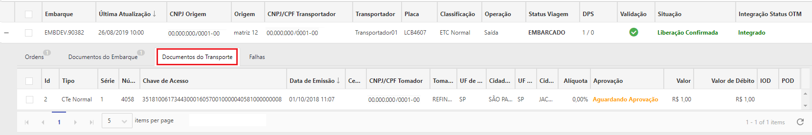 A aba Documentos do Transporte exibe informações da relação de documentos de transporte (DPA, CT-e, NFS-e e Nota de débito) relacionados ao embarque.