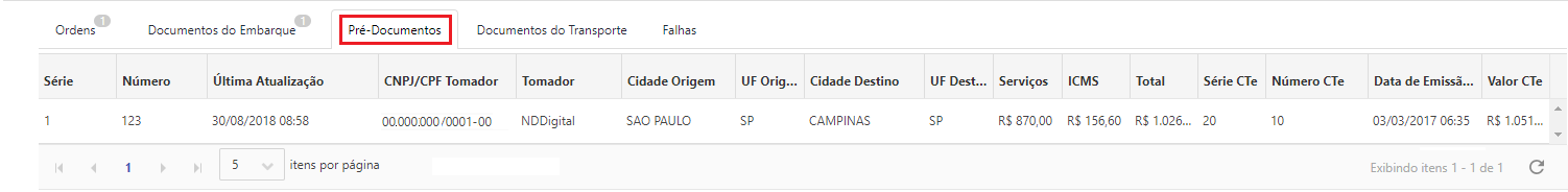 A aba Pré-Documentos exibe informações referentes ao pré-documento gerado e os CT-e vinculados a este, para que possa ter conhecimento dos documentos pertinentes ao embarque. Para embarques que a configuração de conciliação for por saldo, esta aba não é exibida.