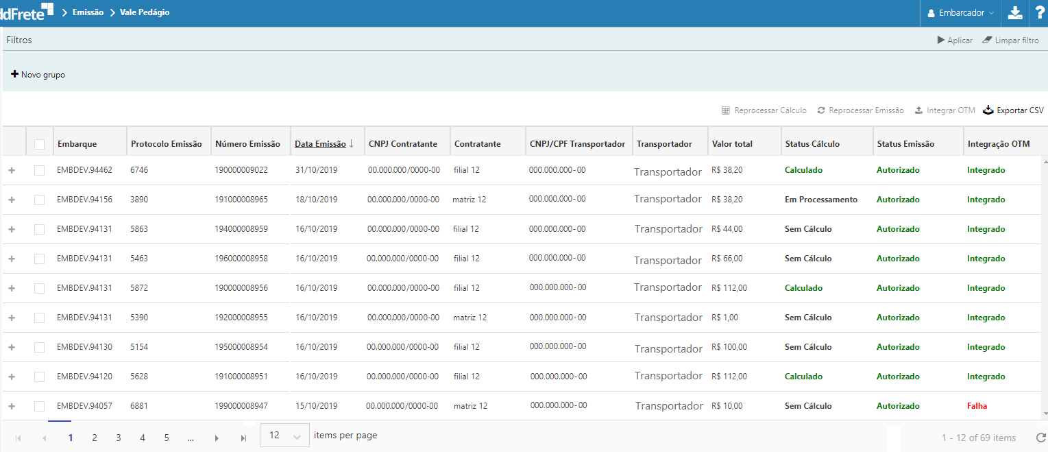 •Status Emissão: Status da emissão do vale-pedágio, podendo obter o status igual à Pendente, Autorizado, Em Processamento , Falha e Cancelado.