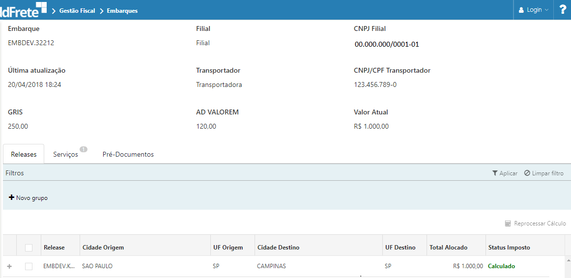 •Impostos: Apresentado os valores dos impostos, o qual é gerado o cálculo a partir da configuração realizada nas Regras de Imposto, em Configurações Gerais do portal do embarcador, nessa aba também é possível visualizar os valores de Gris e Ad Valorem, quando houver cálculo dos mesmos na Release. Na grid é possível visualizar os impotos referente a pré-icms calculados a partir dos custos bases e agregar no base da release, e pré-icms comeplementar, calculados a partir dos custos acessórios configurados como CT-e complementar.