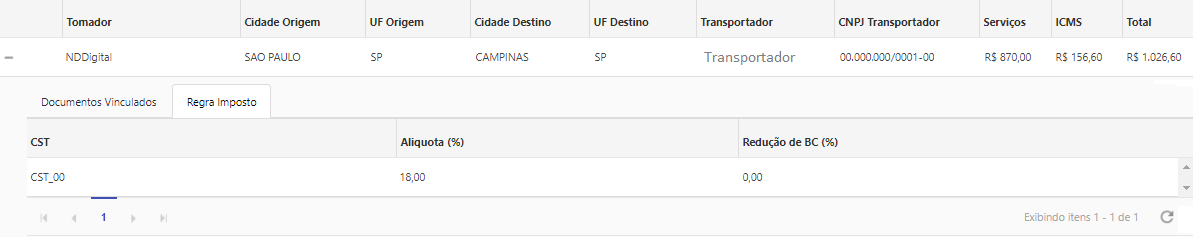 Ao acessar os detalhes do Pré-Documento através do botão + apresentado em cada registro. É possível visualizar os detalhes do documento, os quais são divididos em duas abas Documentos Vinculados e Regra de imposto.