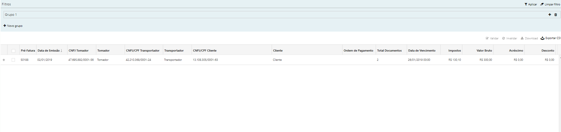 Para visualizar os documentos da fatura, clique no botão +, disponível em cada registro.