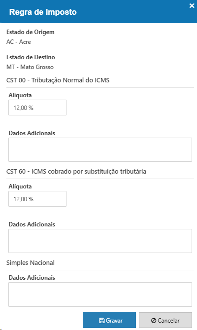 Ao acessar a tela de edição, é apresentado a Origem, Destino e a % de alíquotas que será cobrado, conforme imagem.