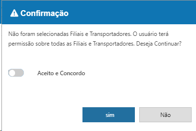 Caso não seja selecionado Filial ou Transportador para o Usuário, será mostrado um alerta em tela. Se desejar prosseguir será dado permissão ao Usuário sobre todas as filiais e transportadores .