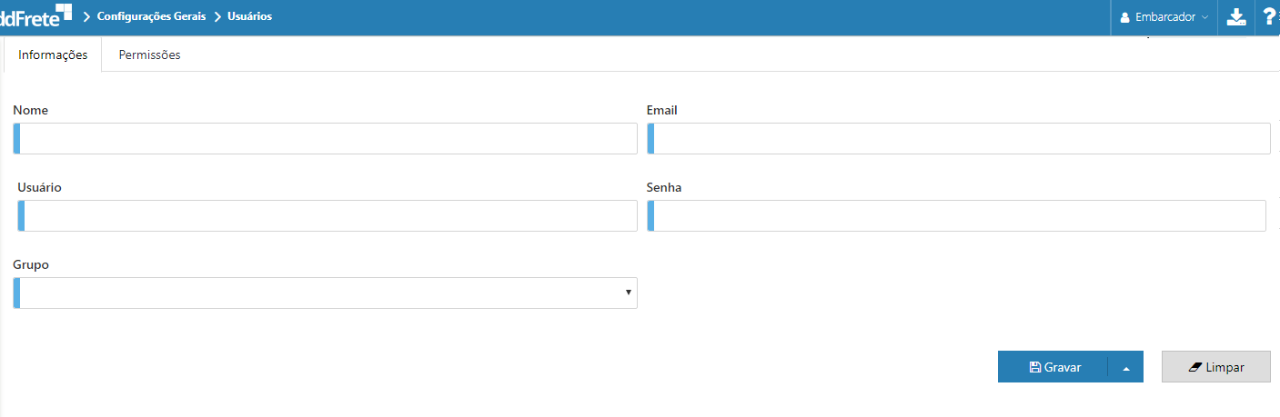 Os campos mostrados na imagem abaixo são obrigatórios para concluir o cadastro, o campo Grupo define o modelo de usuário e as respectivas funções que ele terá acesso.