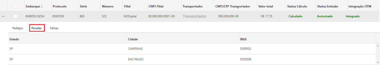 •Paradas: É apresentado todas as paradas contidas no embarque.