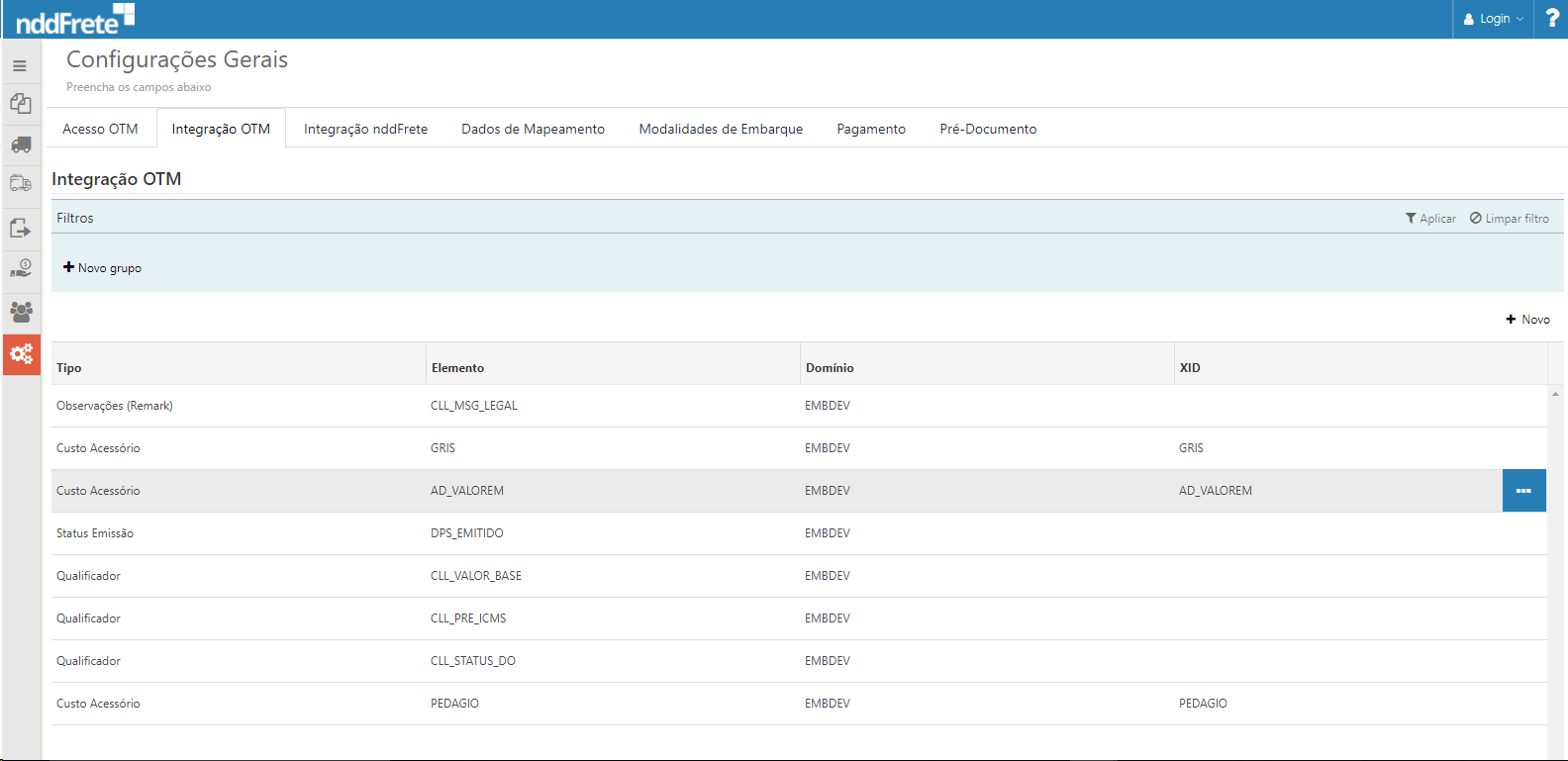 •Em cada cadastro, é necessário informar o Domínio utilizado no OTM para que a integração seja realizada corretamente. •Apenas o tipo Custo Acessório tem o campo XID como obrigatório , para os outros cadastros o campo XID é bloqueado. |