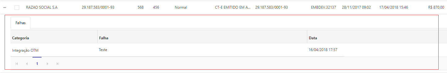 Falhas - Mostra o motivo da falha de integração com o OTM.
