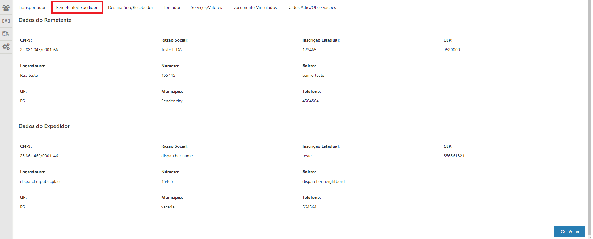 Na segunda aba é possível visualizar os dados do Remetente/Expedidor capturados na recepção do documento.