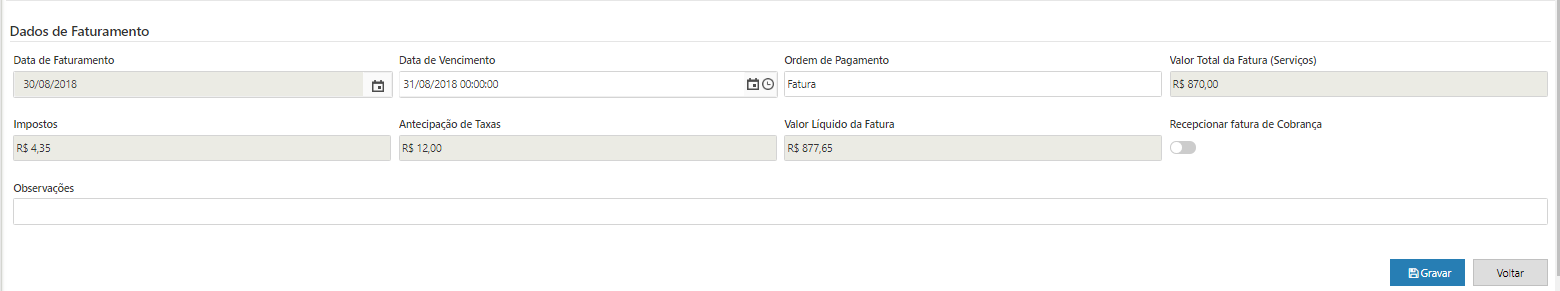 •Data de Faturamento: Data em que a fatura está sendo gerada, não permite modificar é apenas a data atual;