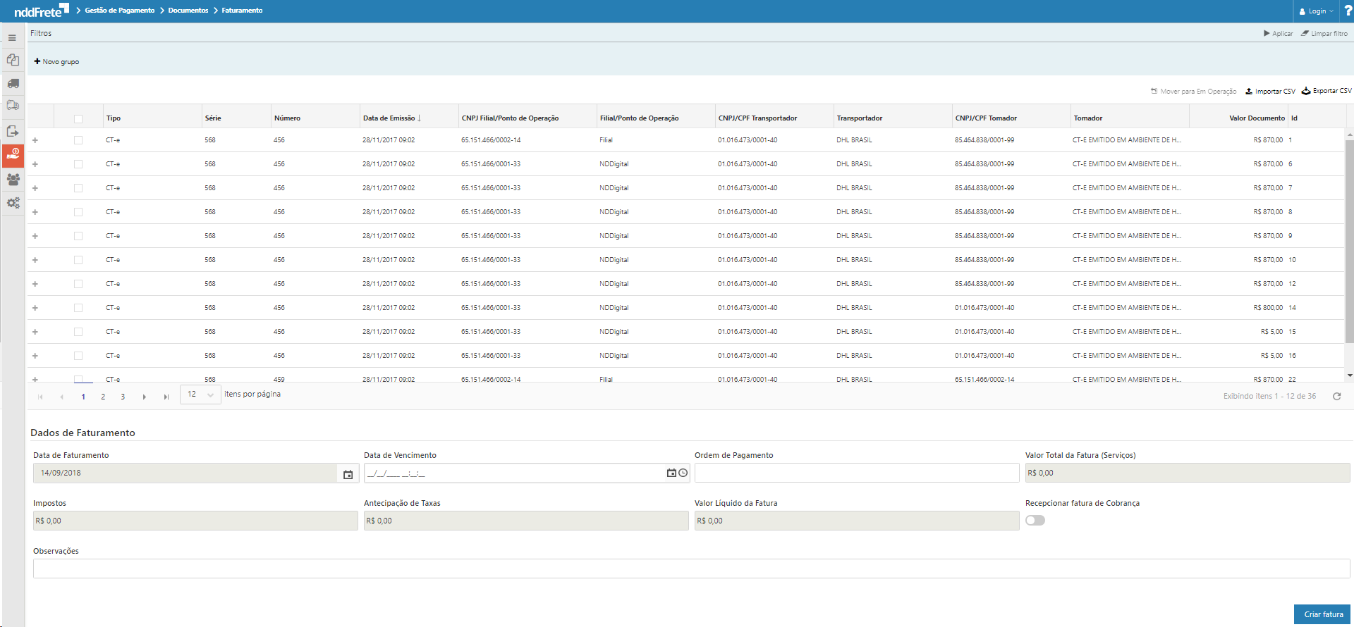 A opção Criar Fatura localizada no canto inferior direito da tela, permite gerar a fatura com as informações de faturamento informadas manualmente em tela, passando os documentos selecionados para o status de "faturamento". Nesse momento é gerada a Pré-fatura para que posteriormente possa ser integrada conforme necessários aos transportadores.