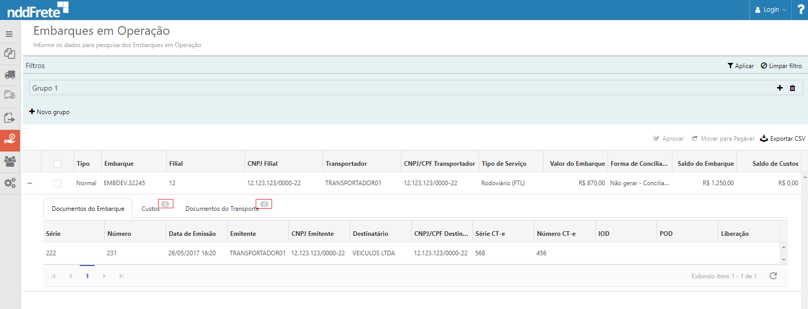 Nos detalhes de cada embarque provisionado são apresentados os dados dos documentos vinculados ao mesmo, sendo: