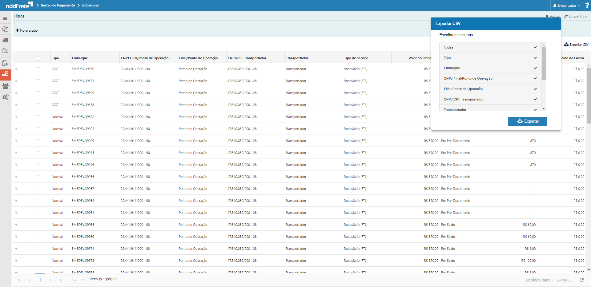 Nos detalhes de cada embarque, ao clicar no