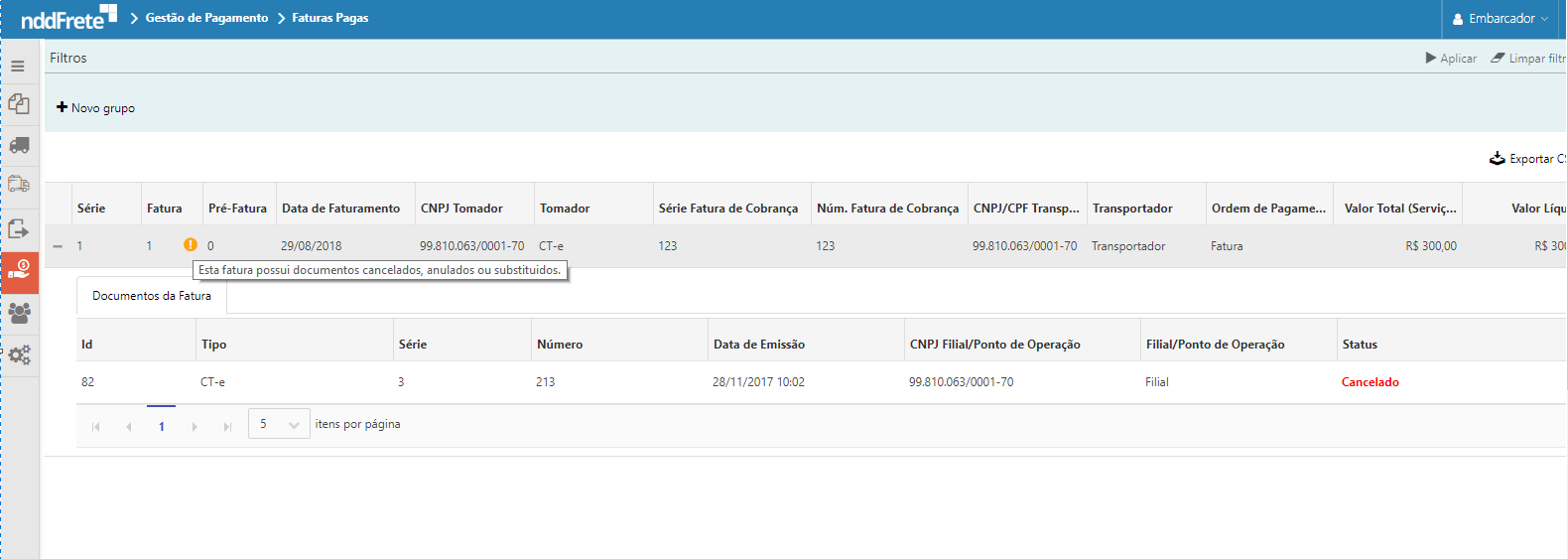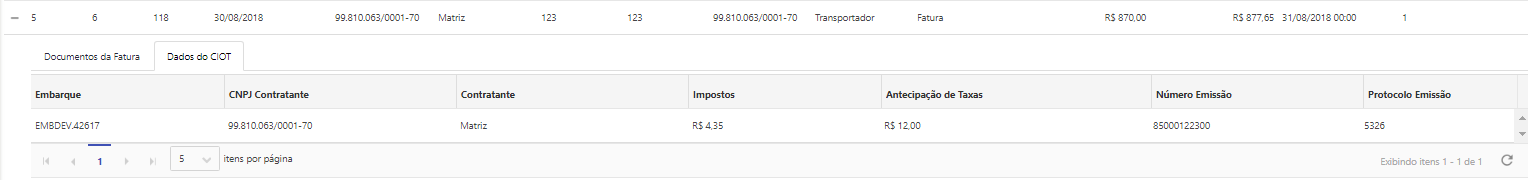 Caso o documento for um CIOT, a série do documento relacionado a fatura será exibido em branco. |