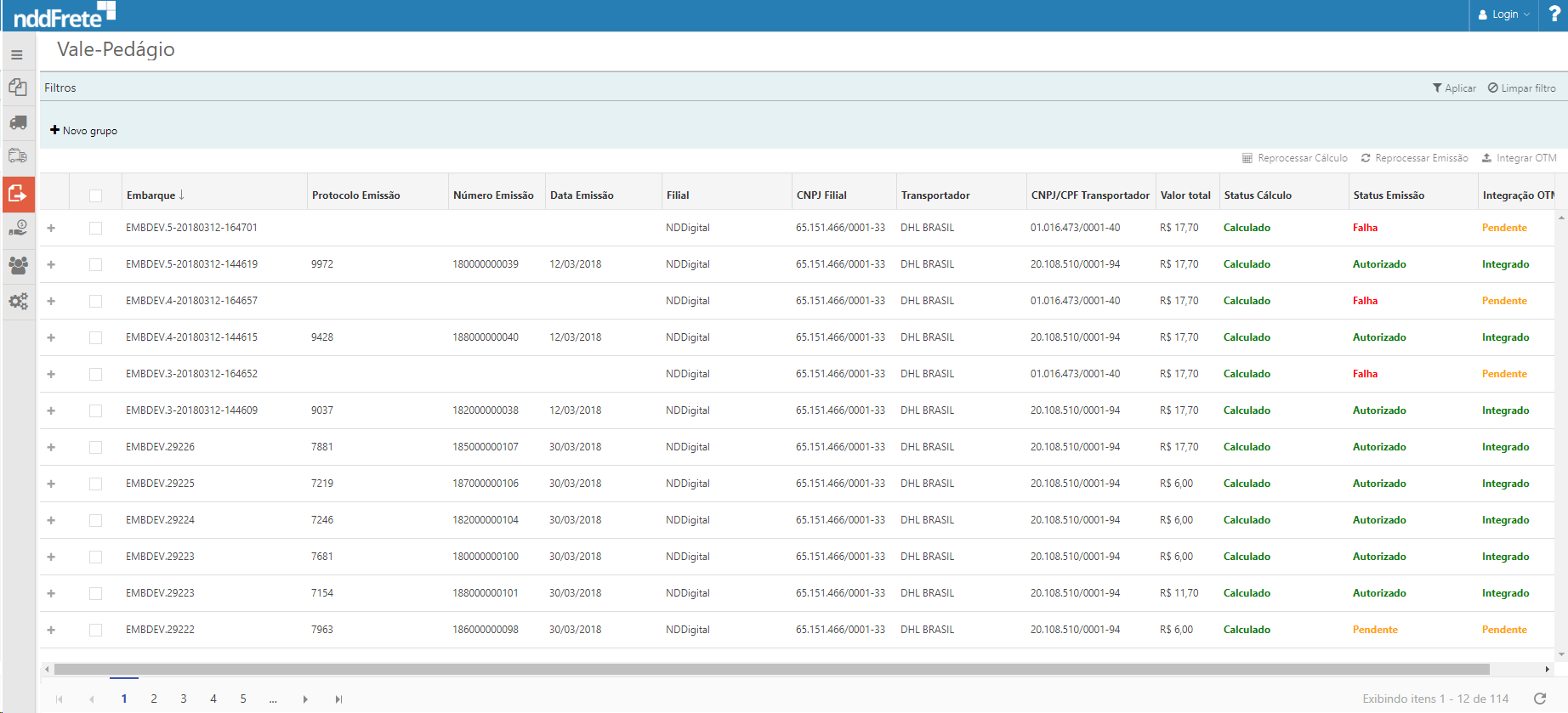 •Integração OTM: Status de integração com o OTM, sendo possível apresentar o status igual à Pendente, Enviando, Integrado e com Falha.