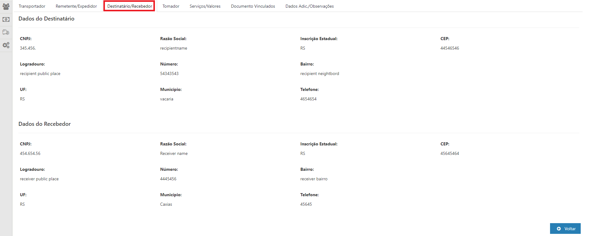 A aba Destinatário/Recebedor exibe os dados desses participantes, capturados ao recepcionar o documento.