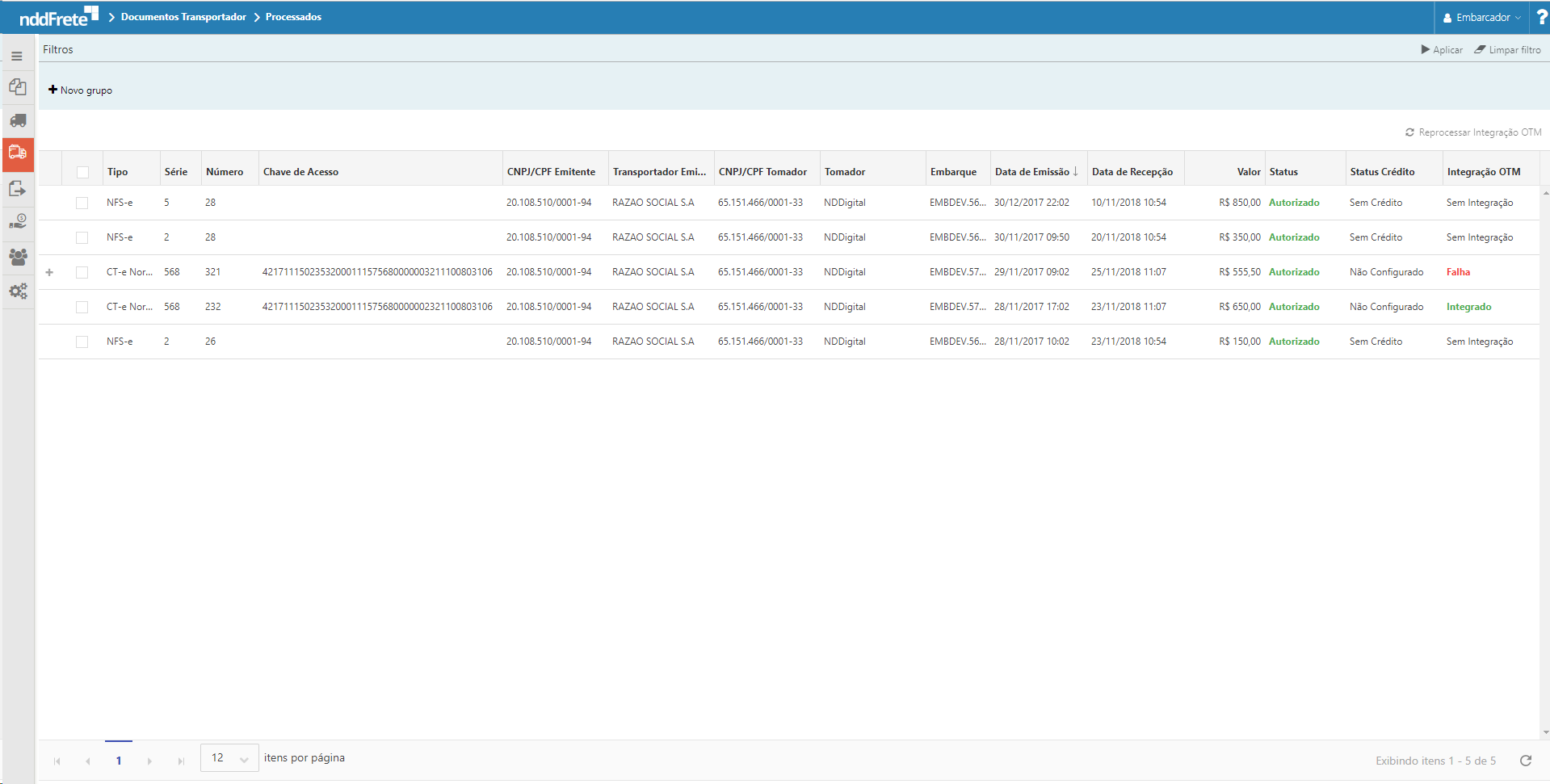 A funcionalidade Processados relaciona em uma área específica, os CT-es e NFS-es recepcionados do transportador e que foram corretamente internalizados na aplicação.