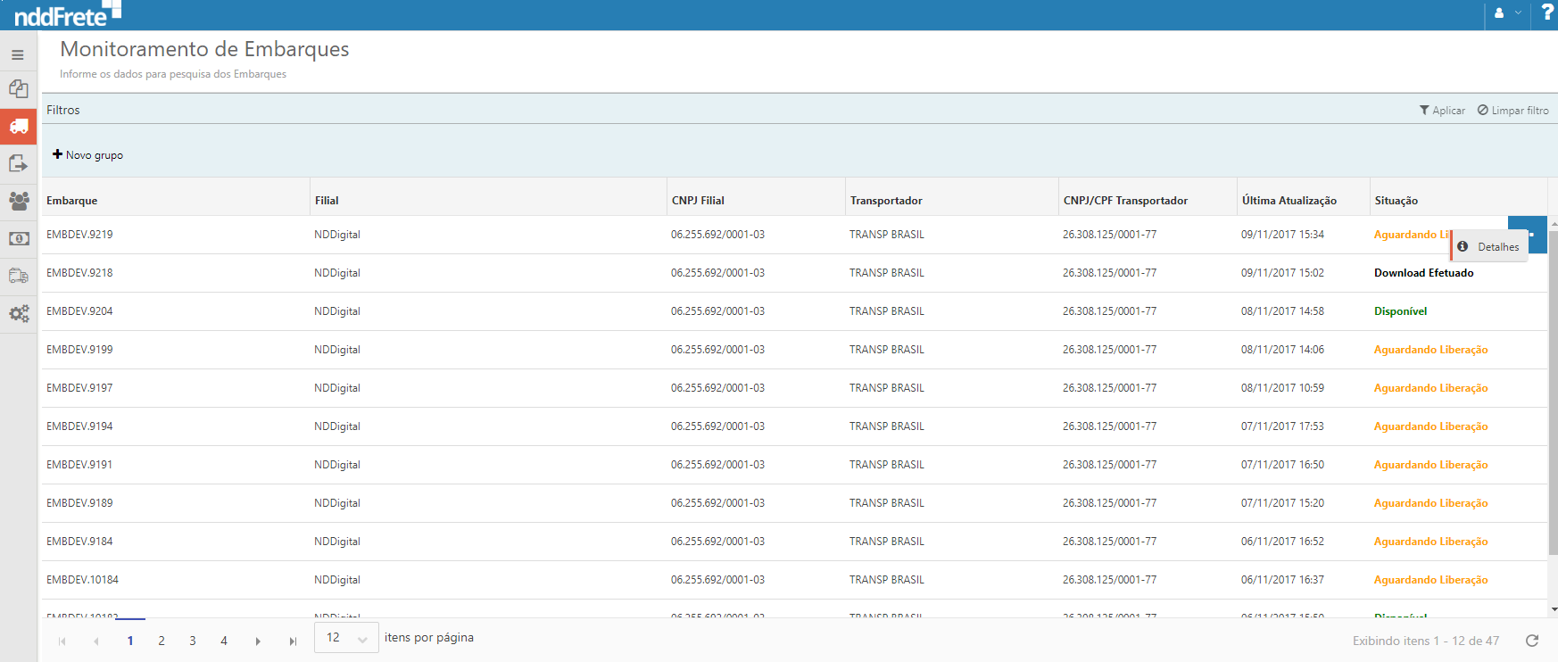 Para visualizar os Detalhes do embarque, clique no menu de contexto apresentado em cada registro e em Detalhes, conforme imagem.