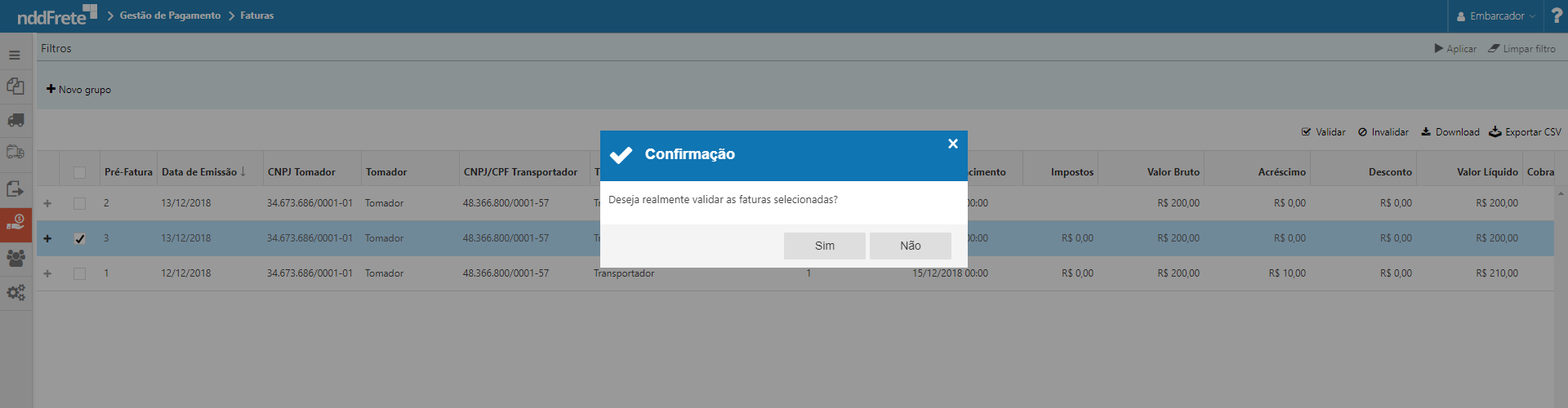 Ao clicar na ação "Validar" é exibido um pop-up de confirmação se deseja realmente fechar a fatura selecionada: