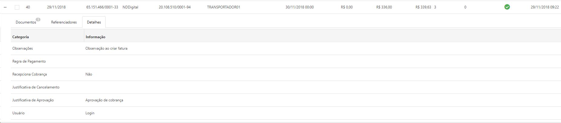 •Justificativa de Aprovação: Caso uma fatura de cobrança for aprovada, para tal fatura, o motivo desta exibe na justificativa de aprovação;