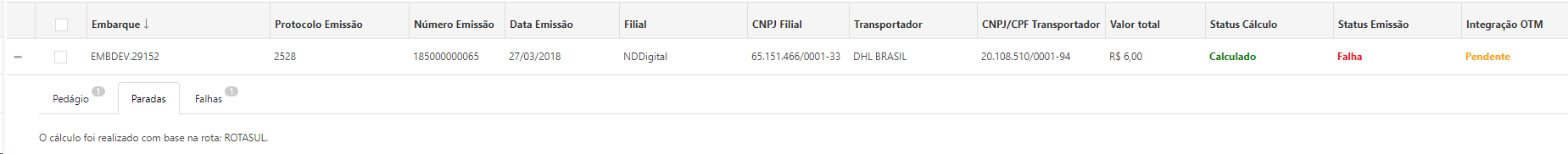 •Integração OTM: Status de integração com o OTM, sendo possível apresentar o status igual à Pendente, Enviando, Integrado e com Falha.