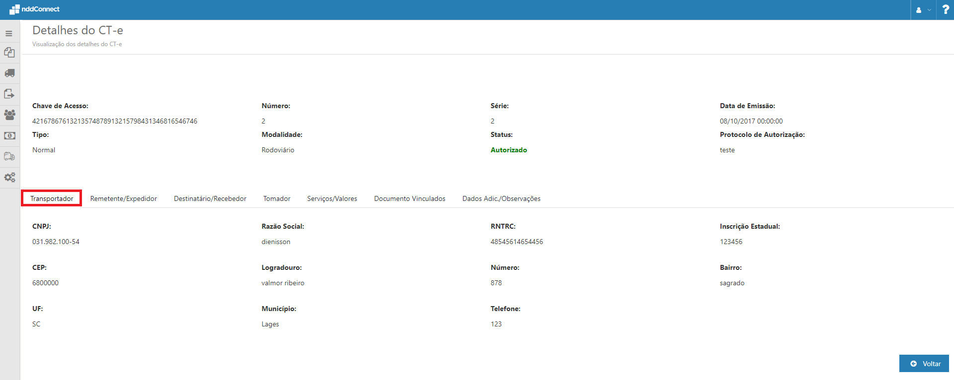 A aba transportador exibe os dados do transportador, capturados ao recepcionar o documento.