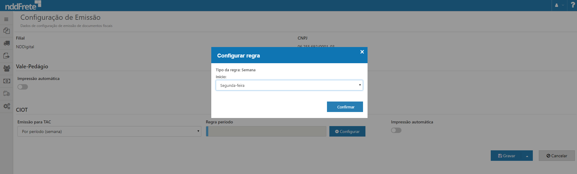 Clique em Confirmar, para finalizar a configuração da emissão do CIOT.