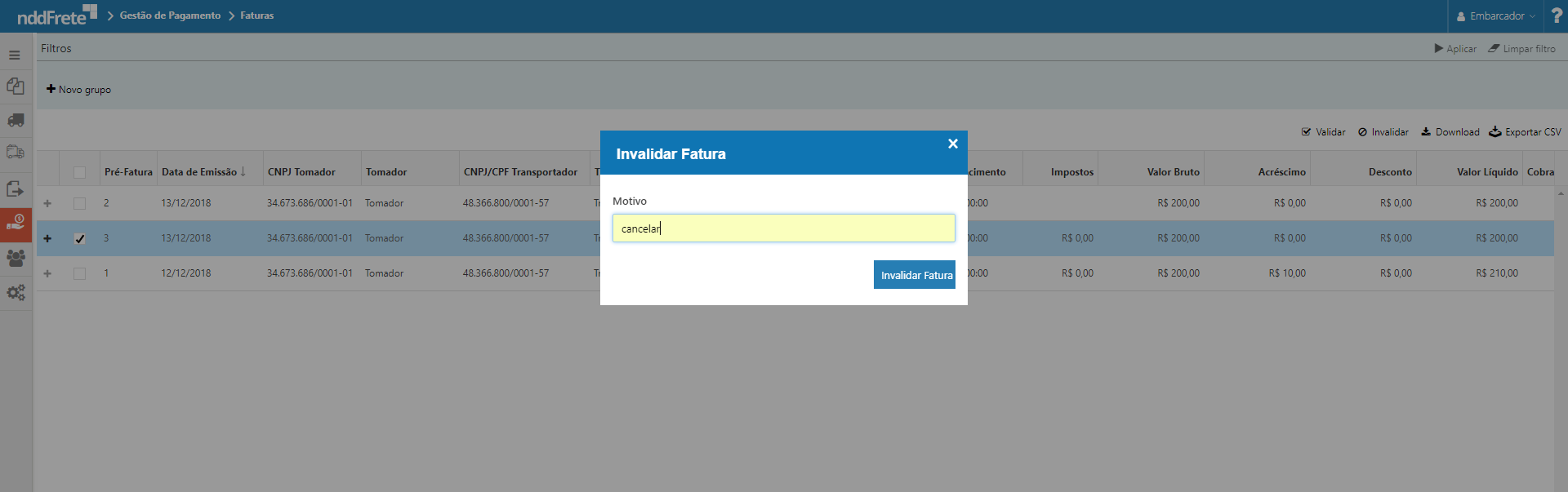 Ao clicar na ação "Invalidar", é possível cancelar somente faturas com a validação pendente e deve-se informar o motivo do cancelamento. Ao invalidar uma fatura, os documentos que pertencem a mesma retornam para pagamento e a fatura fica com a validação inválido.