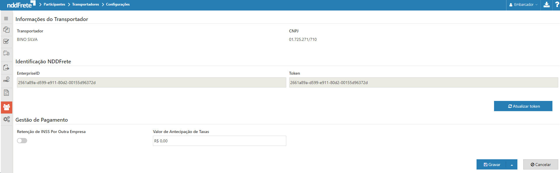 Os dados de identificação NDDFrete, são criados automaticamente na recepção do transportador. Porém é possível atualizar o token, para que as informações de autenticação com o web service sejam renovadas. |