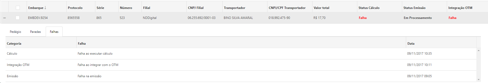 •Falhas: É mostrado todas as falhas registradas para o embarque.